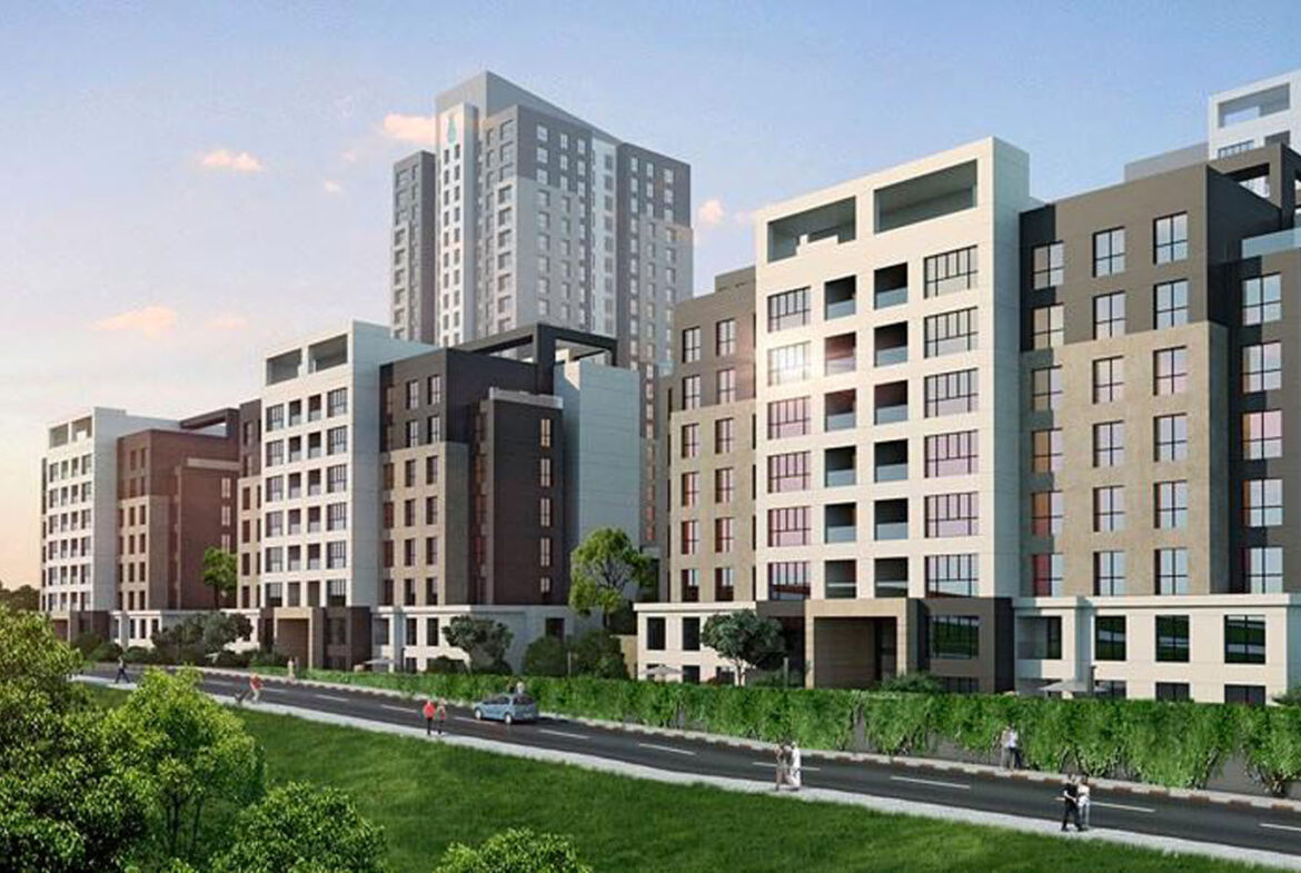 The project consists of 10 blocks with different height starting from 4 floors to 27 floors and there are 724 housing units and 52 shops.